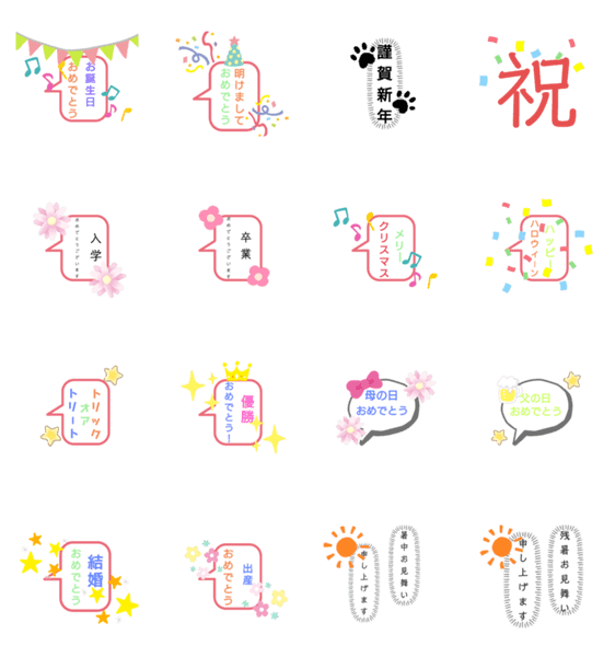 お正月、誕生日などお祝いの時、使えます。※同じ種類でも、吹き出しの大きさが違いますが、すみません。