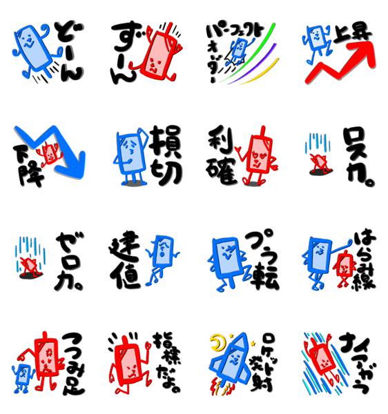 青い陽線のYO君と赤い陰線のINちゃんのゆるゆる手描きスタンプです☆投資、トレード仲間と盛り上がろう☆