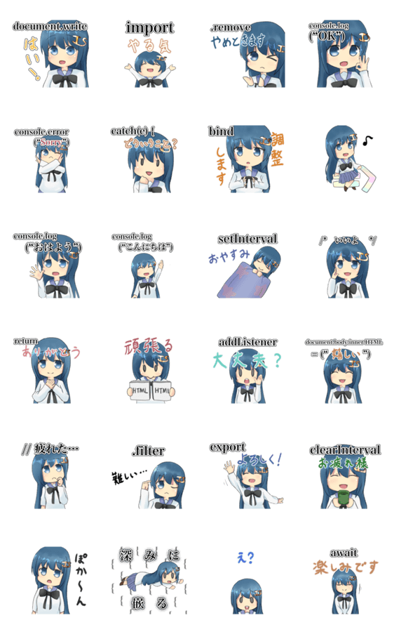 | スタンプ説明 | JavaScript(JS)、プログラミングのテイストを 楽しめるスタンプです♪ プログラムを書くことが好きな方や、 挨拶にも普通のスタンプにもお使いいただけます。 |