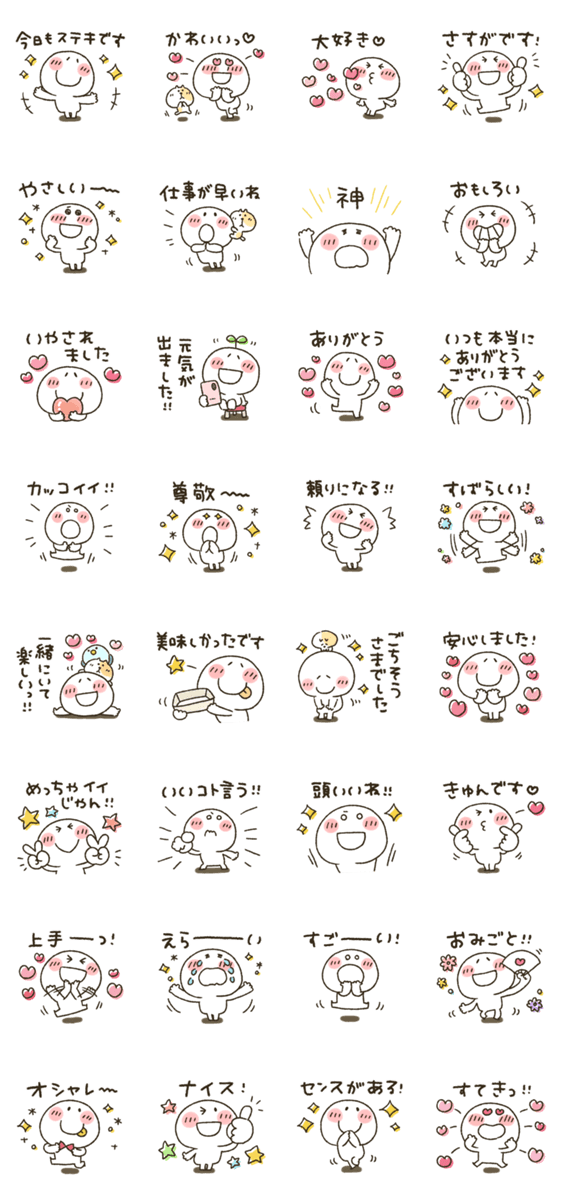 まるぴのスタンプ87作目は、褒めてばかりのスタンプです。誉められたい!優しい/すごい/偉い/さすが/素敵/頭いい/カッコイイ/かわいい/上手/おみごと
