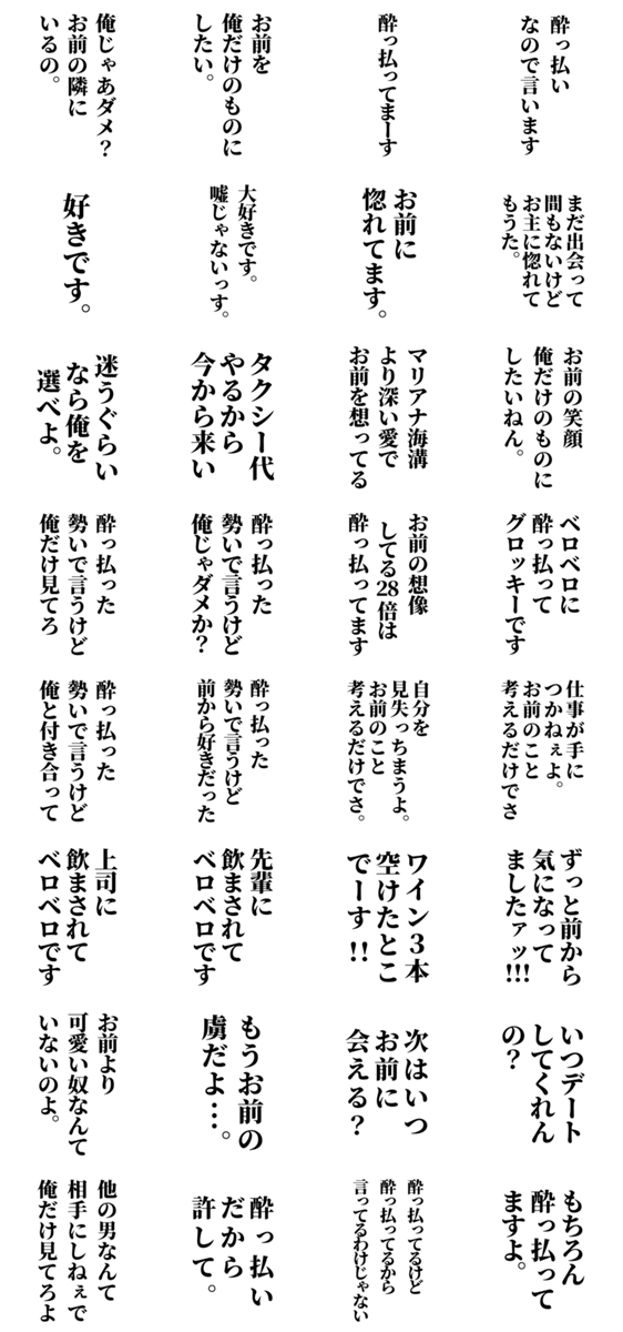 【BIGスタンプ】酔っ払ってる時こそあの子に勢いよく伝えたい【惚れた/酒/飲み会/恋愛/彼氏/彼女/浮気/束縛/カップル/香水のせい】 ※このスタンプはトークルームで大きく表示されるBIGスタンプです。