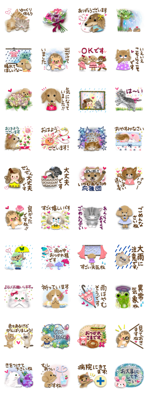 敬語が多めのセットで、日常言葉に加え、雨の日に使えるスタンプもたくさんあります。いろいろなシチュエーションに使える便利な文字なしスタンプは、5つ入っています♡
