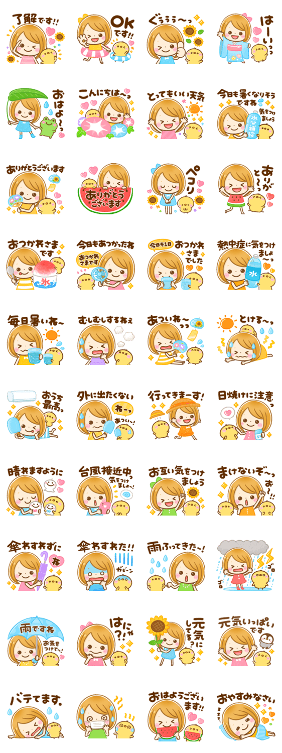 夏に役立つ♪毎日使える♪あいさつや天気、気持ちを伝える言葉がいっぱい♪明るくカラフルで元気いっぱいの女の子の大人可愛いスタンプです♪敬語も♡
