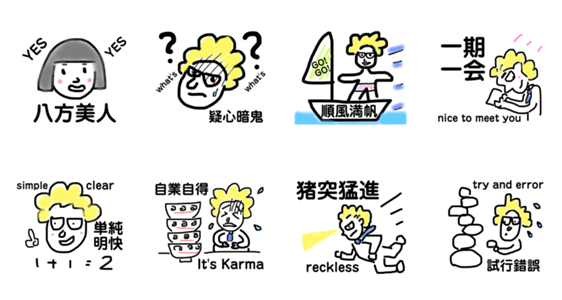 頑張るサラリーマンへ。天然パーマのスーちゃんと、彼女のワコちゃん。四字熟語に加え英語を交えてより分かりやすくなりました。