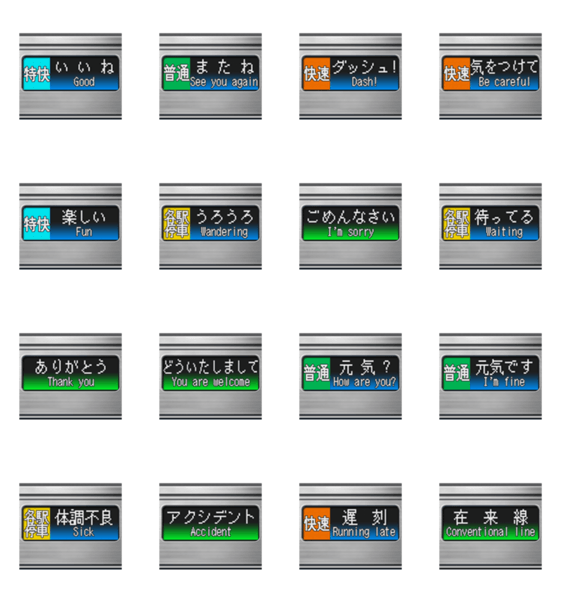 日本の鉄道の部品をアニメーションにしました。列車の液晶画面に言葉を表示して挨拶できます。日本語と英語で表示。