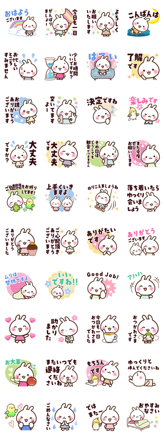日常のあらゆるシーンで気遣いを見せるうさぎのスタンプです。 敬語とパステルカラーでやさしい気持ちが伝わります。