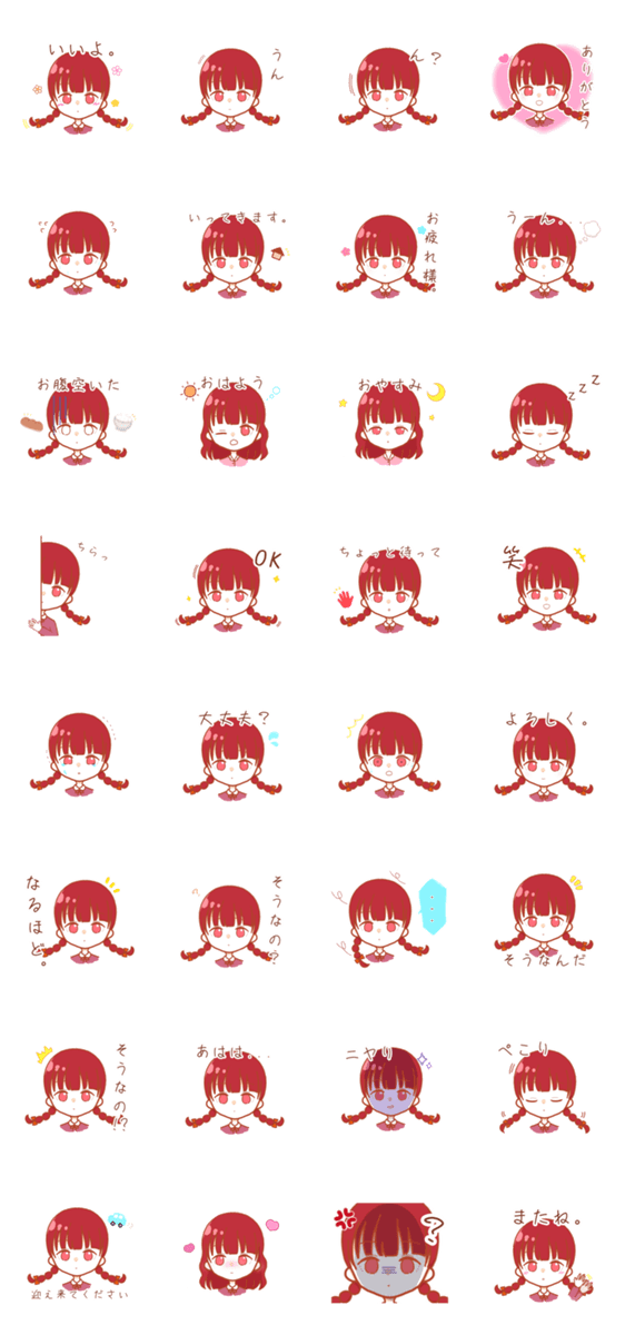 基本無表情なみつあみの女の子。 ですがたまに笑顔を見せてくれます♡ 友達や家族に毎日使えるスタンプです♪