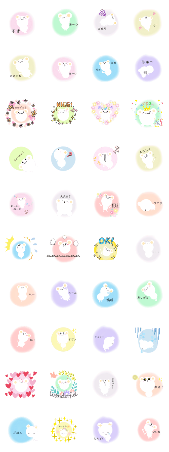 すき、くま、嗚呼、悩む、だめ、怒、平常心、お腹すいた、はい、ありがとう、はぁ、おめでとう、OK、まじ、おはよう、了解、どうした、笑、すごい、誕生日、きつい、好き、