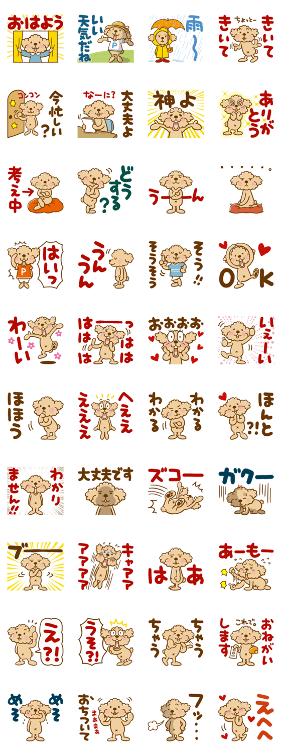 限りなく人間に近い犬、トイプードルのぷう太郎の毎日使えるお返事やあいづちをまとめた便利なスタンプです。デカ文字なので見やすいです。
