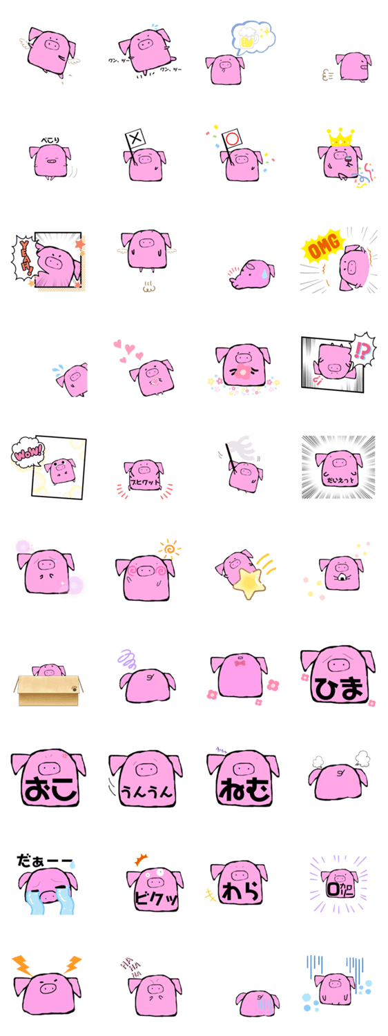 ピンクのブタさんのスタンプです。ひま、おこ、ねむ、うんうん、泣、ビクッ、笑、0カロリー、○、×、ビール、ぺこり、ダイエット、スクワット、OMG、yeah、wow、好き、嬉