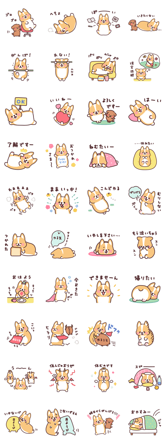 全然やる気が出ないしがんばれないしゴロゴロしたい!毎日やる気がない!という人たちへ、のんびりコーギーの頑張らないスタンプです。学校も会社もゆるく、できる範囲で!