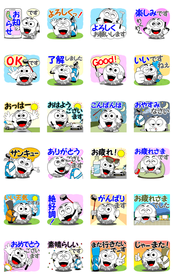 ゴルフボールのアニメーションが画面に大きく飛び出します。 ゴルフ以外の挨拶にも使えるスタンプです。