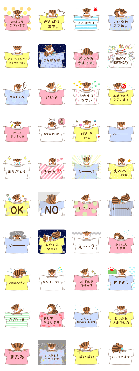 久しぶりのりすたんスタンプ。 敬語も少し入った、日常で使いやすいセットです。