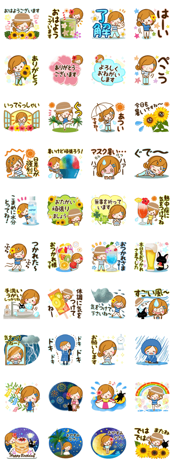 敬語も入った日常に便利な大人かわいい夏スタンプです♪やさしい黒猫ちゃんも一緒♪少しでも癒されますように。 「ほのぼのカノジョ」シリーズ