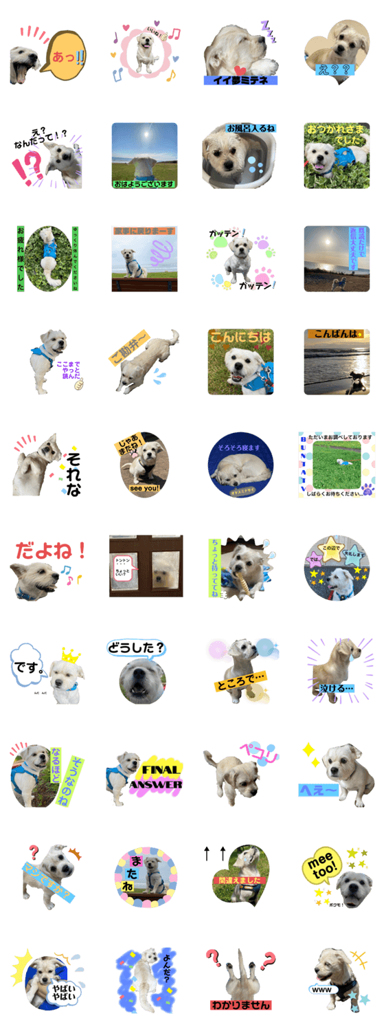 あったら便利なあいづちと、定番のあいさつがあります。探しやすいように五十音順で並べました。犬好きさんも、そうでない方にも使いやすいスタンプです!