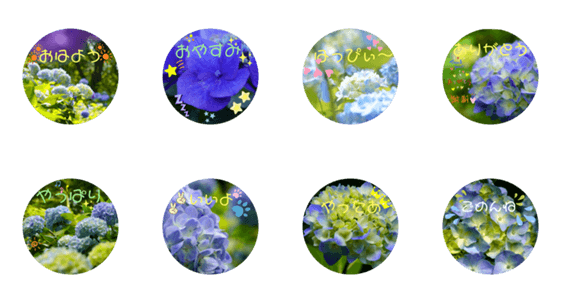 | スタンプ説明 | 紫陽花の写真と文字を組み合わせた挨拶スタンプです。写文字(あいさつ) |