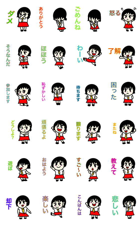 スタンプ説明 おかっぱの髪型をした女性のキャラクターです。