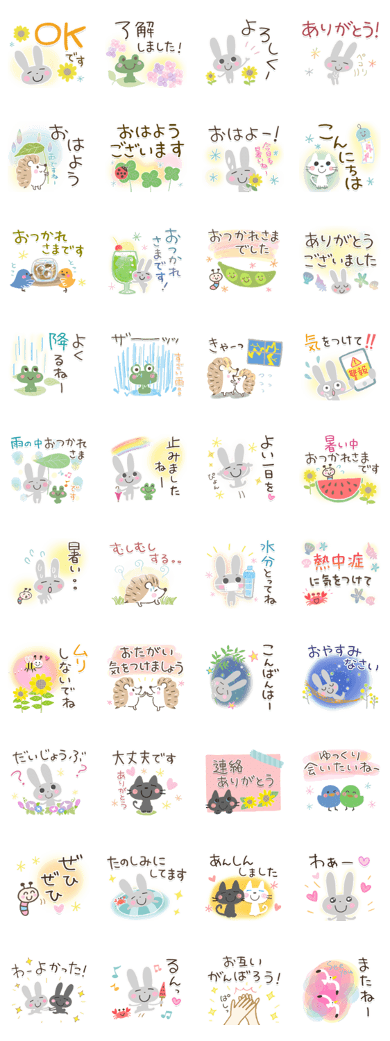 梅雨から真夏まで、よく使う言葉は大きな文字で使いやすいスタンプです。ひらりーーの大人の気遣いシリーズ14。 敬語/挨拶/天気/夏/気遣い/でか文字/うさぎ/猫