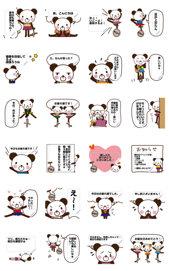 第3弾のスタンプです!一輪車が大好きなばんだーずです!好きなメッセージを入れられます。 現在この商品は一部のスマートフォン版LINE 10.3.0以上のトークルームでのみ使用できます。動作環境の最新情報はヘルプをご確認ください。
