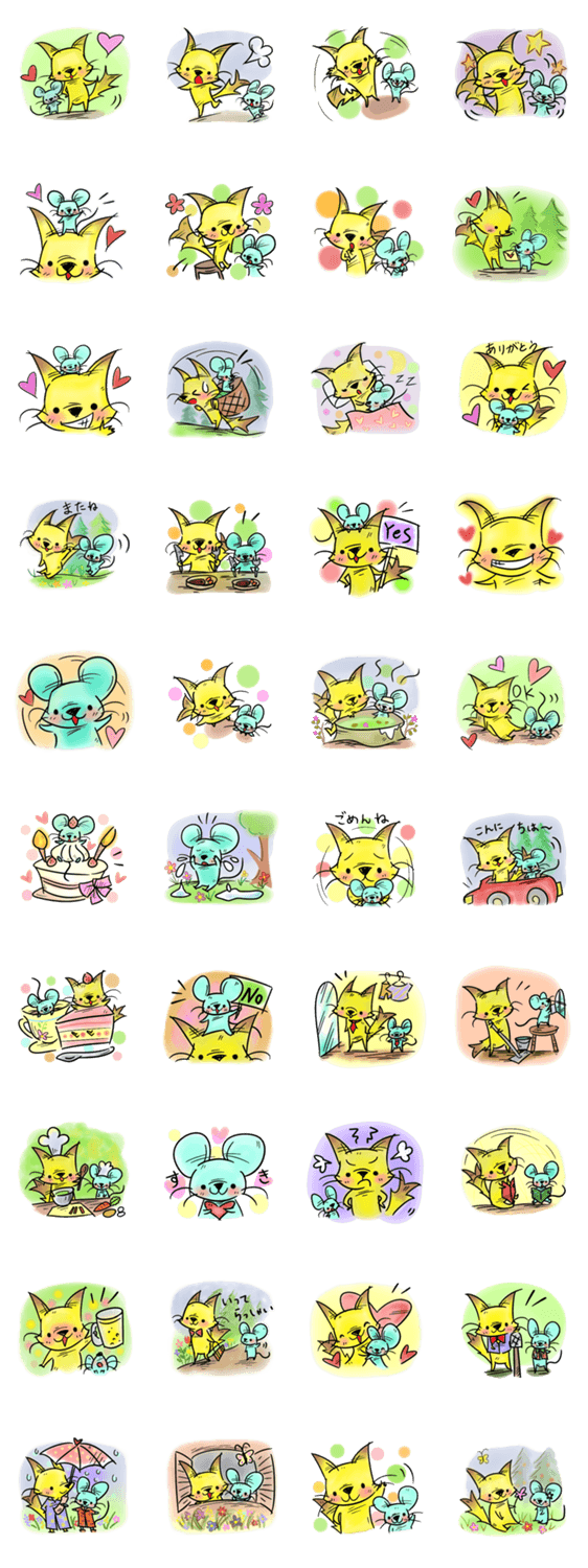 ギザギザしっぽのきつねコン太と、ねずみピョン吉の癒されスタンプです♪