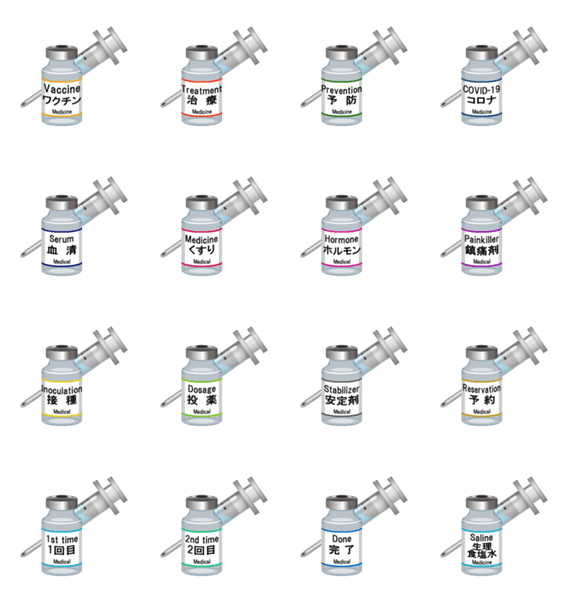 ワクチンや治療薬などを入れる注射器やボトルをデザインしました。英語と日本語で記載しています。
