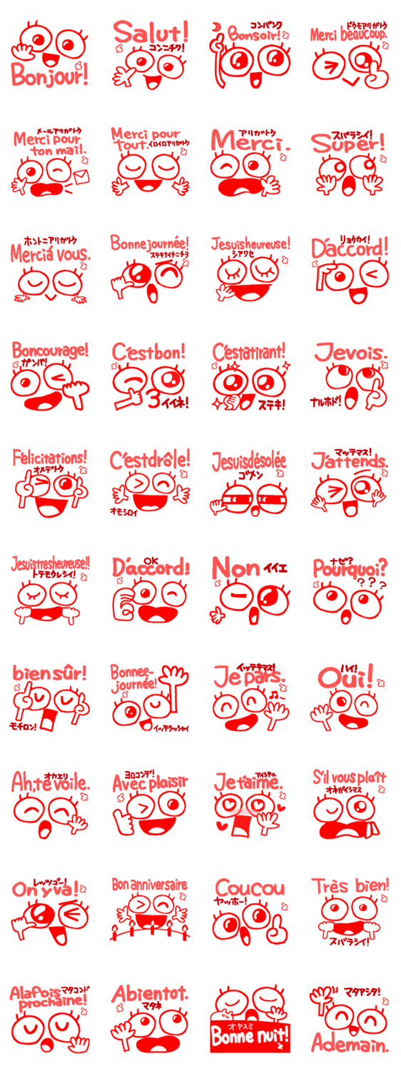 | スタンプ説明 | シンプルリアクション。インパクトあるリアクションで使いやすい。便利なリアクションを集めてみました。(フランス語&日本語の勉強) |