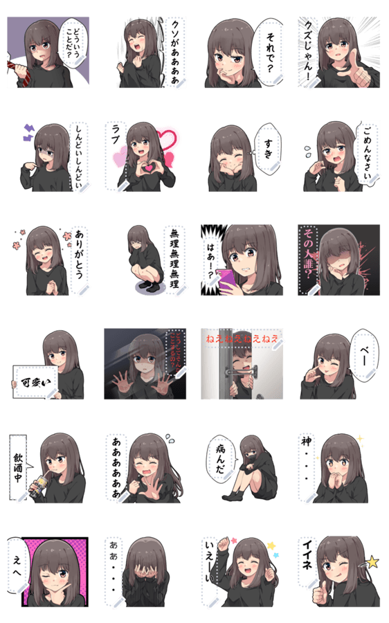 メンヘラ女子のメッセージスタンプです。病み期にオススメです。 現在この商品は一部のスマートフォン版LINE 10.3.0以上のトークルームでのみ使用できます。動作環境の最新情報はヘルプをご確認ください。