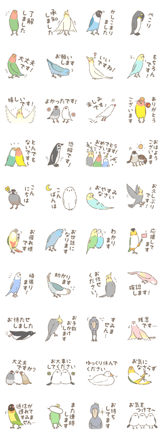 コザクラインコ・セキセイインコ・オカメインコ・ウロコインコ・シロハラインコ等々のインコたちや、ペンギン、野鳥など、とり好きの人のための敬語スタンプです。