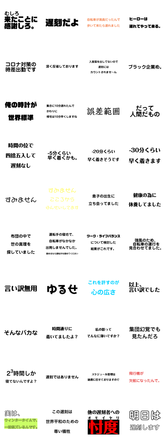 よく遅刻する人、これから遅刻する予定のある人には必須の、遅刻した時専用の言い訳スタンプです。遅刻しそうになったら送って、到着するまでに場を和ませておきましょう。