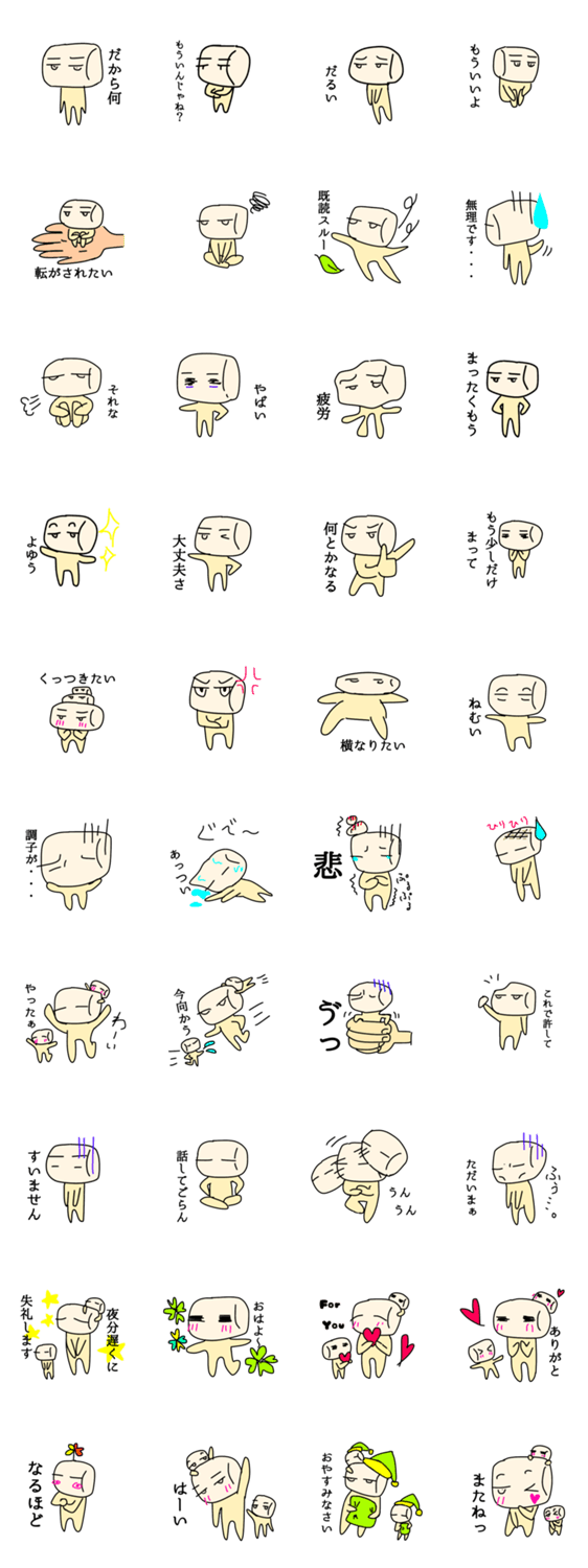 | スタンプ説明 | マシュマロくんというキャラクターです。仲間はミニマシュマロ、チビマシュマロ。仲良しな人と使ってあげてね。 |