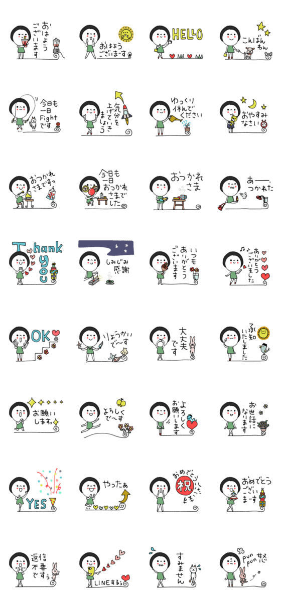 黒髪のレト子がトークをほんわかまとめます♡おはよう/おやすみ/了解/よろしく/おつかれ/ありがとう/など毎日使いたいスタンプできました。
