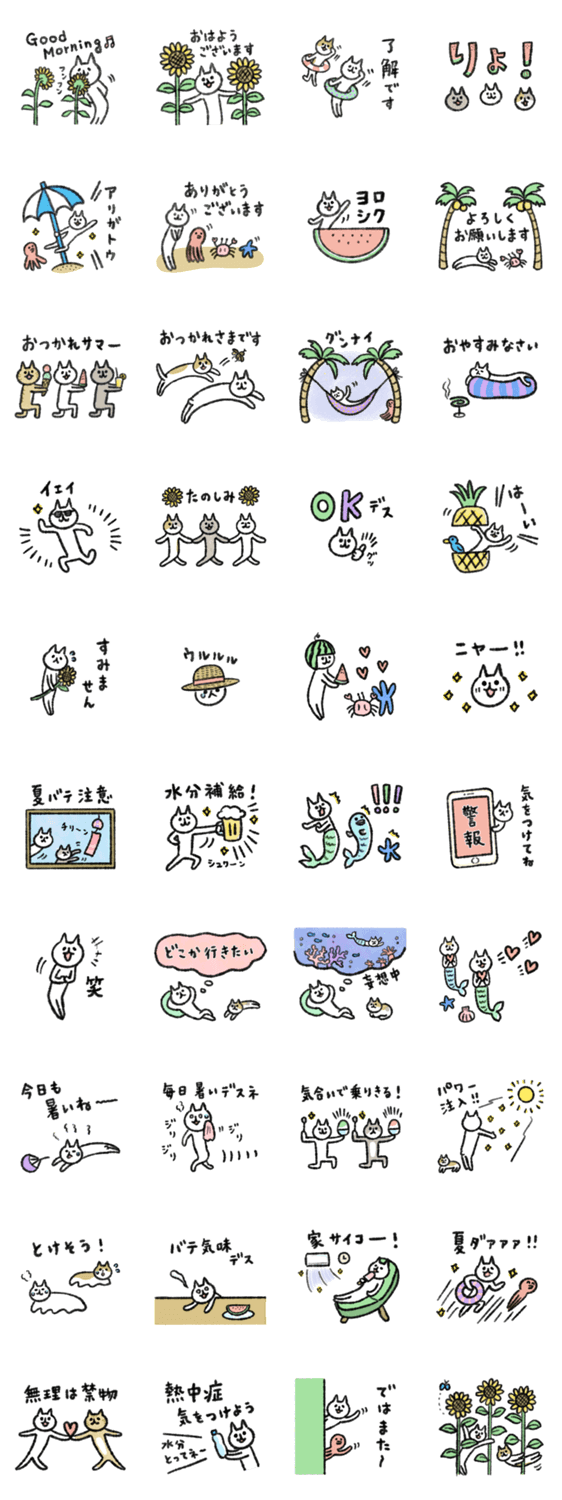 シュッとスリムな猫たちの夏スタンプ。よく使う言葉をたくさん詰め込みました♪