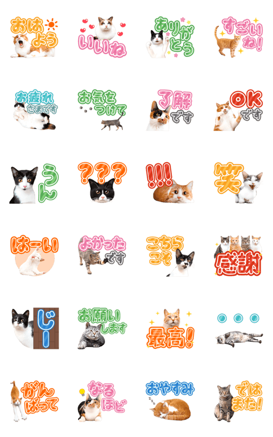 可愛いねこの写真が動く、日常会話で使いやすいスタンプです。三毛猫・茶白猫・黒白猫・キジトラなど、さまざまな猫が登場!文字も大きくて見やすいです。