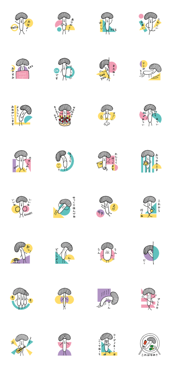 シンプルなきのこちゃんの日常使えるスタンプです♪普段にも毎日使えます♪北欧風/かわいい/癒し/シュール/カラフル/しいたけ