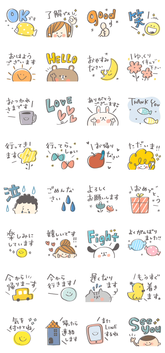 シンプルでかわいい手書きのイラストに読みやすいデカ文字スタンプ。毎日使える基本のセット★かわいい/見やすい/敬語/女の子/男の子/うさぎ/ねこ/くま/犬