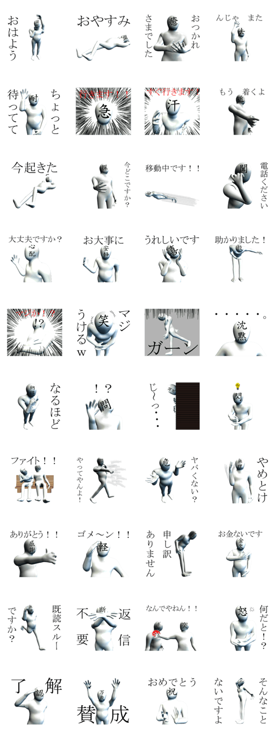 表情の無い人形の顔を文字だけで表現しました。まさに顔文字!!その名も顔文人(カオモジン)!!