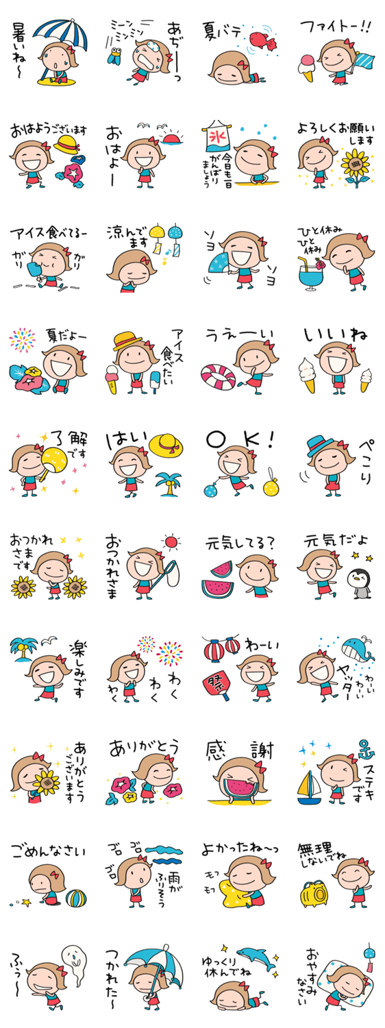 | スタンプ説明 | リボンのマルン。夏大好き編。「暑いね〜」「夏バテ」から「涼んでます」まで。夏の季節の日常会話を楽しもう。家族、学校、お仕事でも。 |