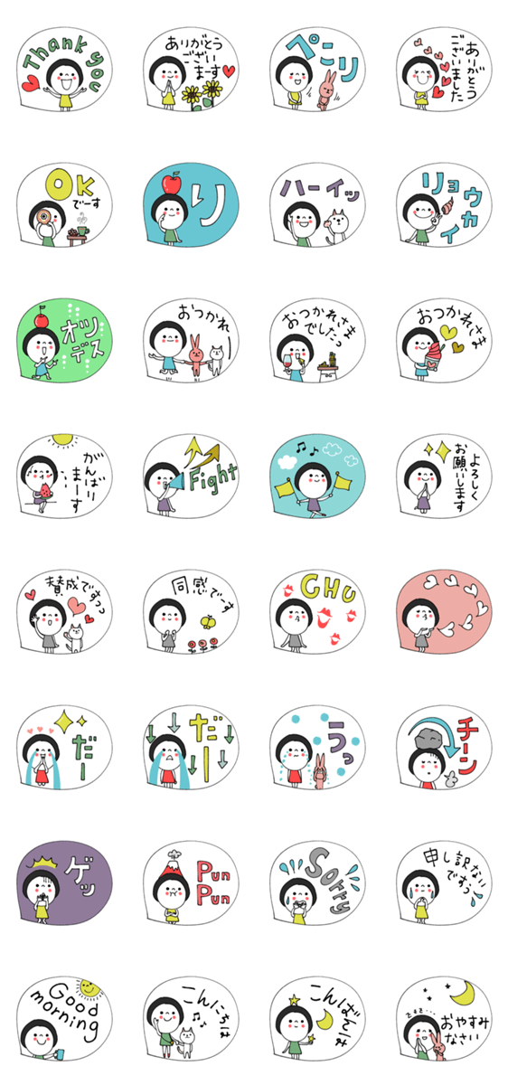 黒髪のレト子がトークをほんわかまとめます♡おはよう/おやすみ/了解/よろしく/おつかれ/ありがとう/など毎日使いたいスタンプできました。