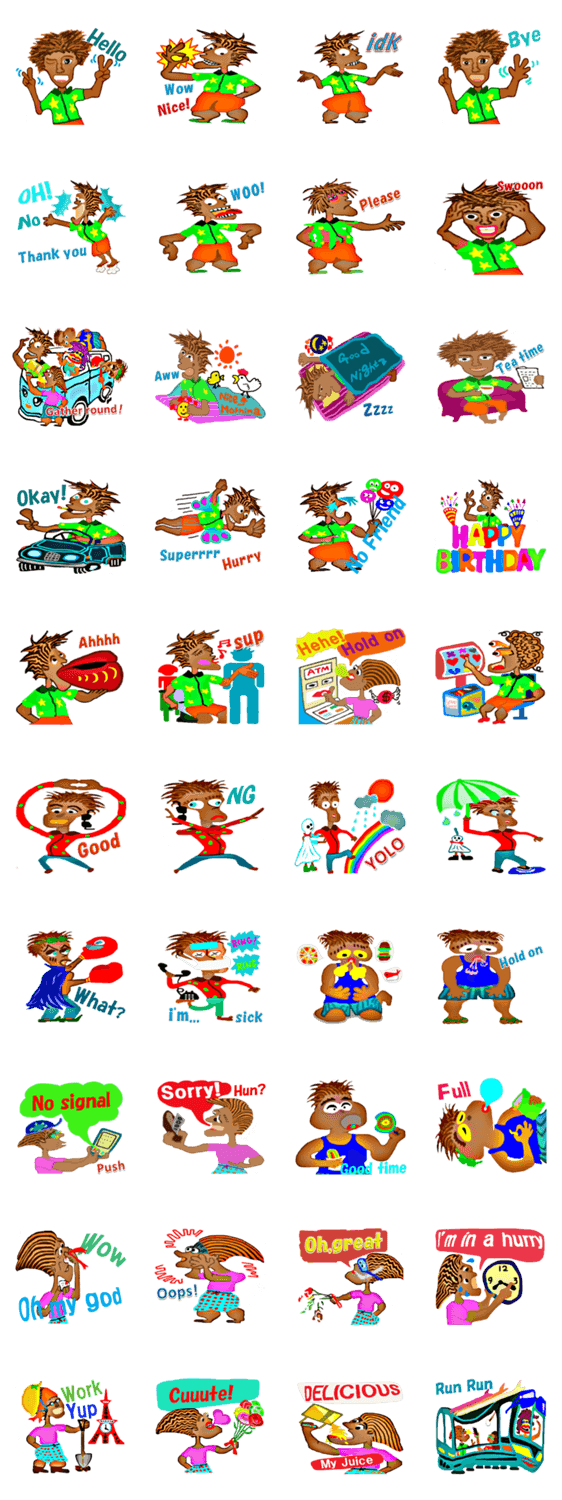 | スタンプ説明 | 陽気なアメリカ人とクレージーボーイの生活をイメージして作り、ハプニングな友達との付き合いの中で使えるように表情を豊かにしてみました。英語略語を使っています。 |