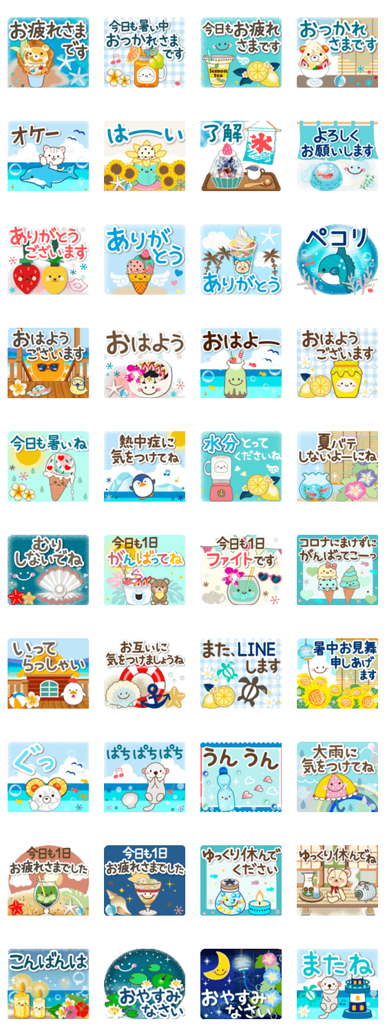 | スタンプ説明 | 夏に使える大きい文字の挨拶スタンプです。サマースイーツやフルーツ、景色など、フォトジェニックなデザインのオーソドックスな挨拶スタンプです。 |
