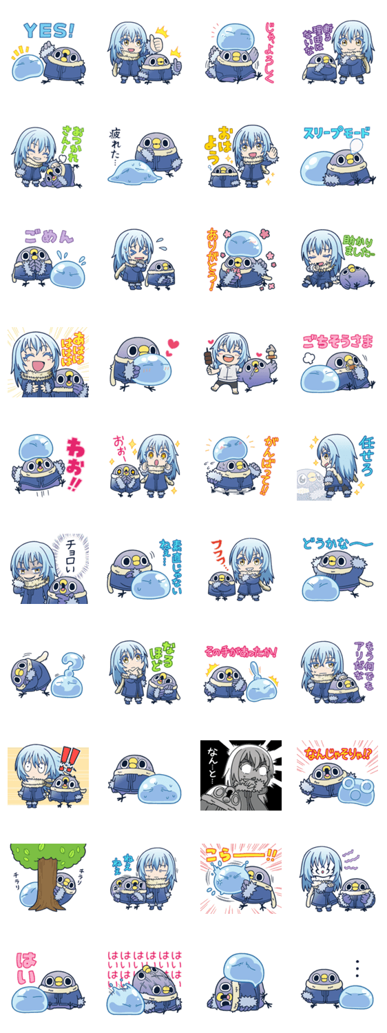 | スタンプ説明 | 「転生したらスライムだった件」のリムルと、面倒だがトリあえず返信シリーズの「めんトリ」のコラボスタンプ第二弾が登場! |