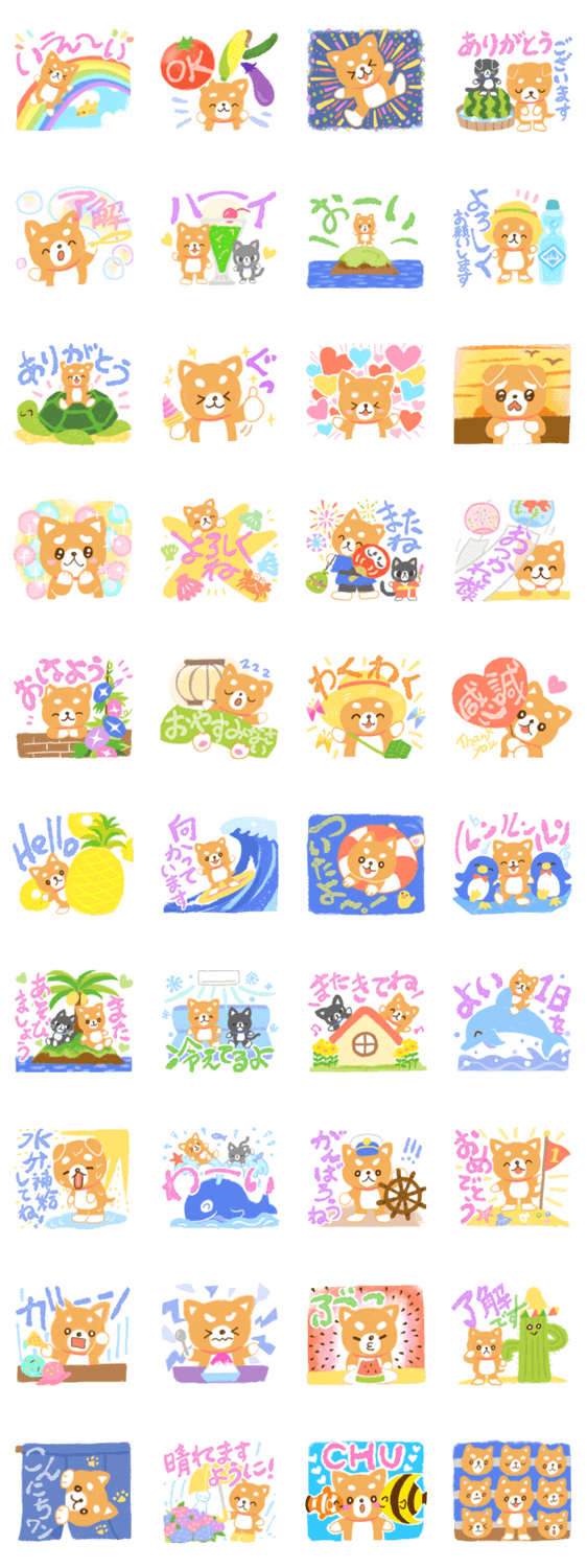 夏デザインの柴犬のしばちゃん。 人間らしい表情をたくさん持ったわんこスタンプです。