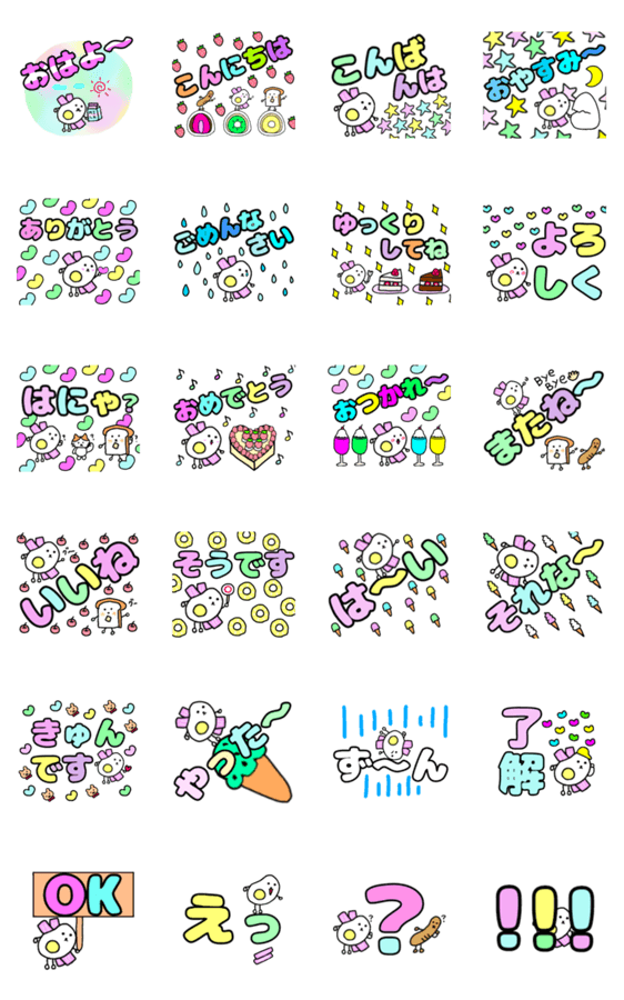 | スタンプ説明 | カラフルすぎるベーコンエッグちゃんです。でか文字です。 |