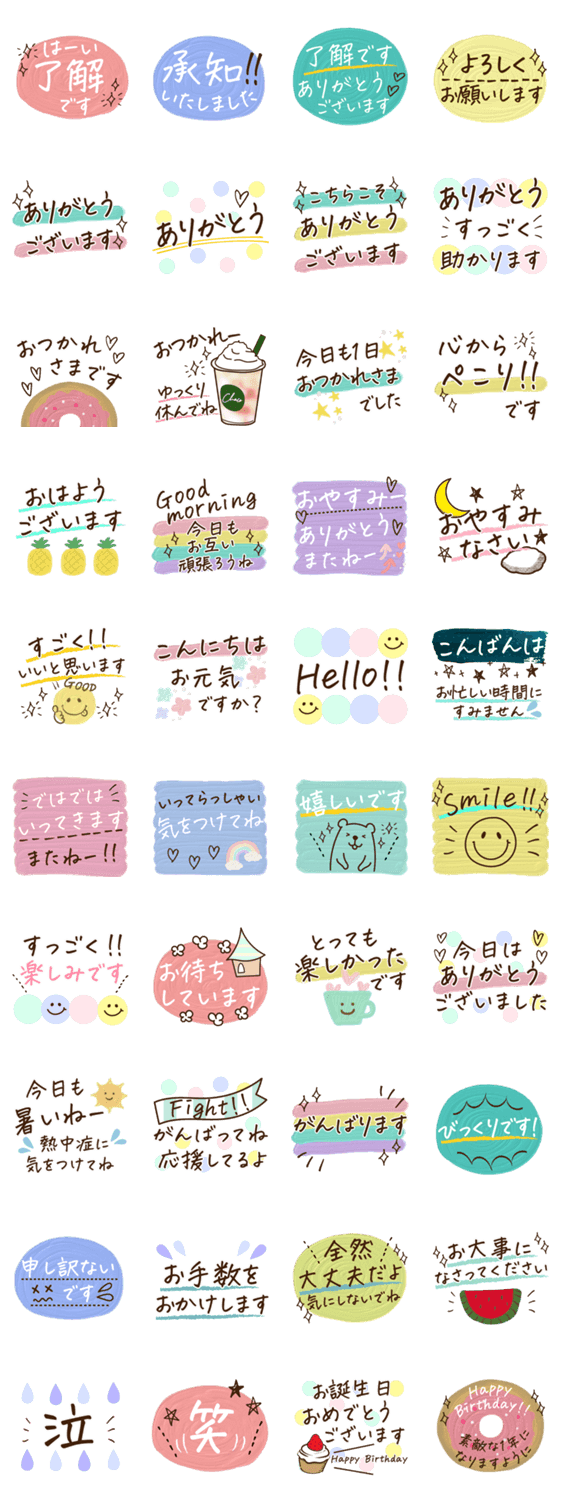 キャラ無しの大人のシンプルな手書きフォントで、よく使う敬語の長文スタンプです。