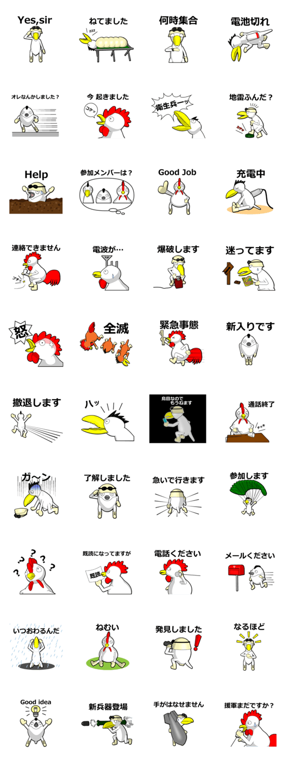 | スタンプ説明 | 戦場(職場)で戦うシュールな「ゆるキャラ」鳥の兵隊さんに命令を!毎日のトークに活用してください |