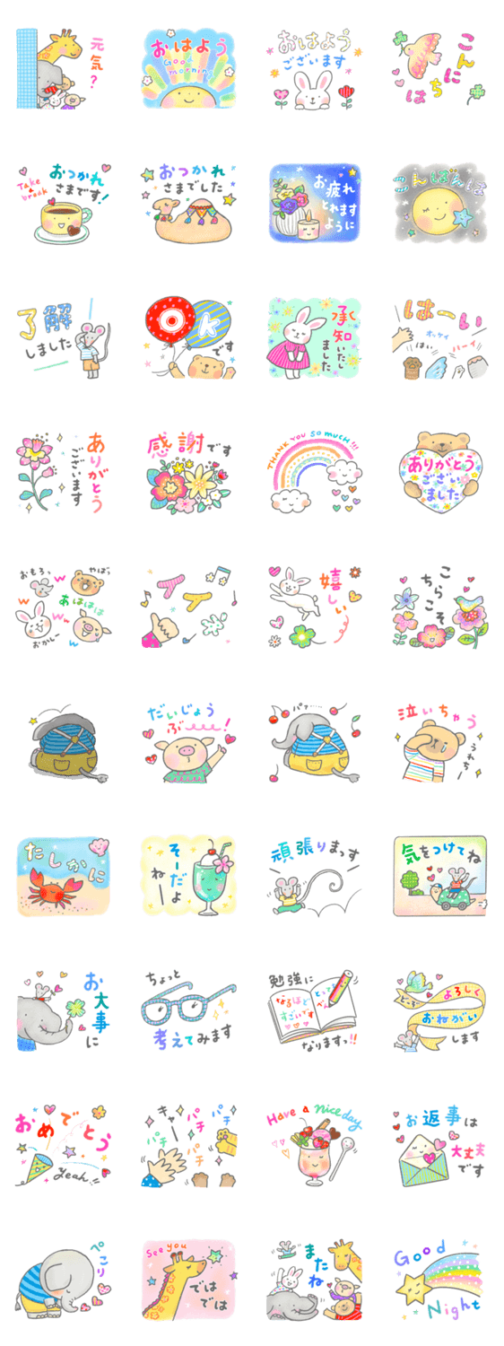 敬語多めで日常使いにとっても便利!仲良し動物たちのカラフルスタンプです。明るいパステルカラーで、トークを盛り上げてね♪