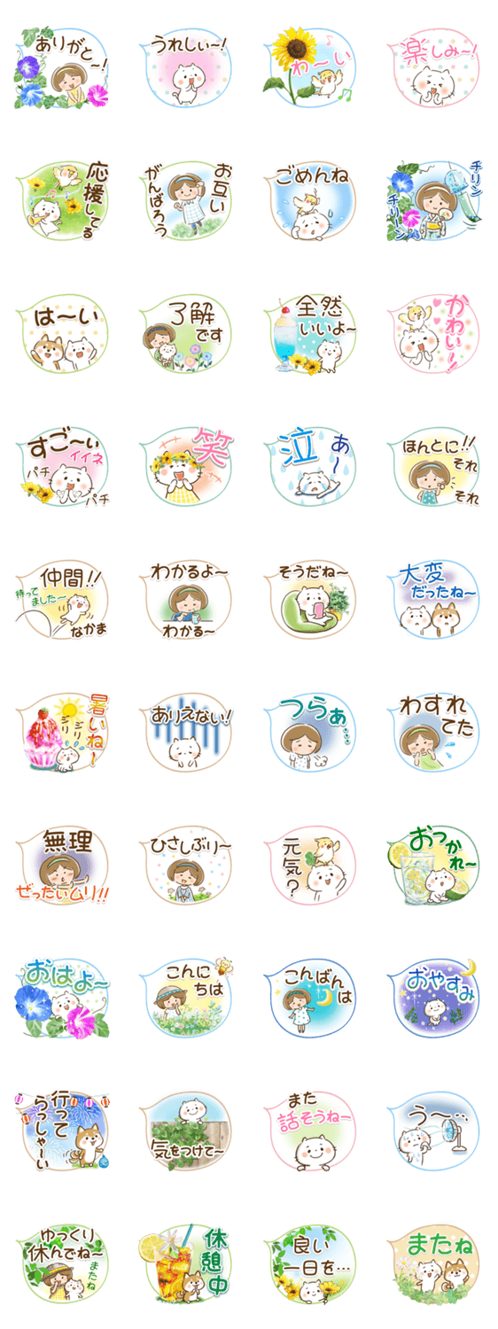 花火、夏祭り、ひまわり、かき氷、朝顔…夏らしいスタンプです。吹き出し、柴犬、ねこ、インコ、女の子、相槌。ほんわかさんシリーズ、他にも販売中です。By よつばらんど