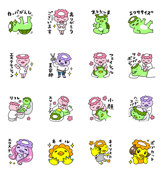 今日の美容は何にしますか⁉️エステサロン、ネイル、美容室、ご自身の美容にカッパエクササイズ、サロンやお客様も使えます。漫画家田島ハルさん制作のスタンプです!