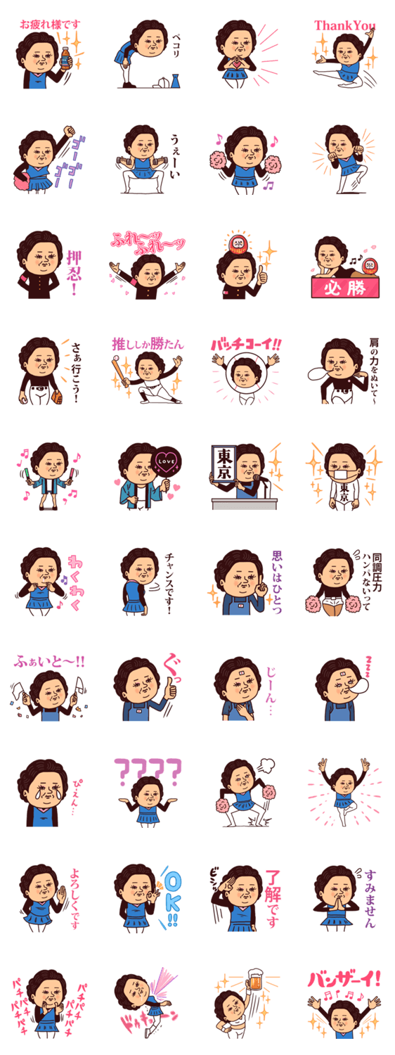 妻、主婦、セレブ、大人女子…色んな顔を持つおばちゃん「ぷりてぃマダム」。チア、野球、東京、部活、受験勉強、母娘の日常にも。シュールでシンプルな応援スタンプ。
