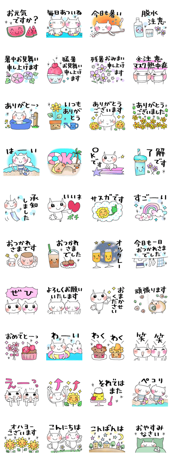 花いっぱい、猫とうさぎのやさしい思いやりの夏。文字が大きくて見やすい、毎日使える40個。シンプル短文、感謝や挨拶、気持ち伝わるスタンプです。暑中見舞いも便利です。
